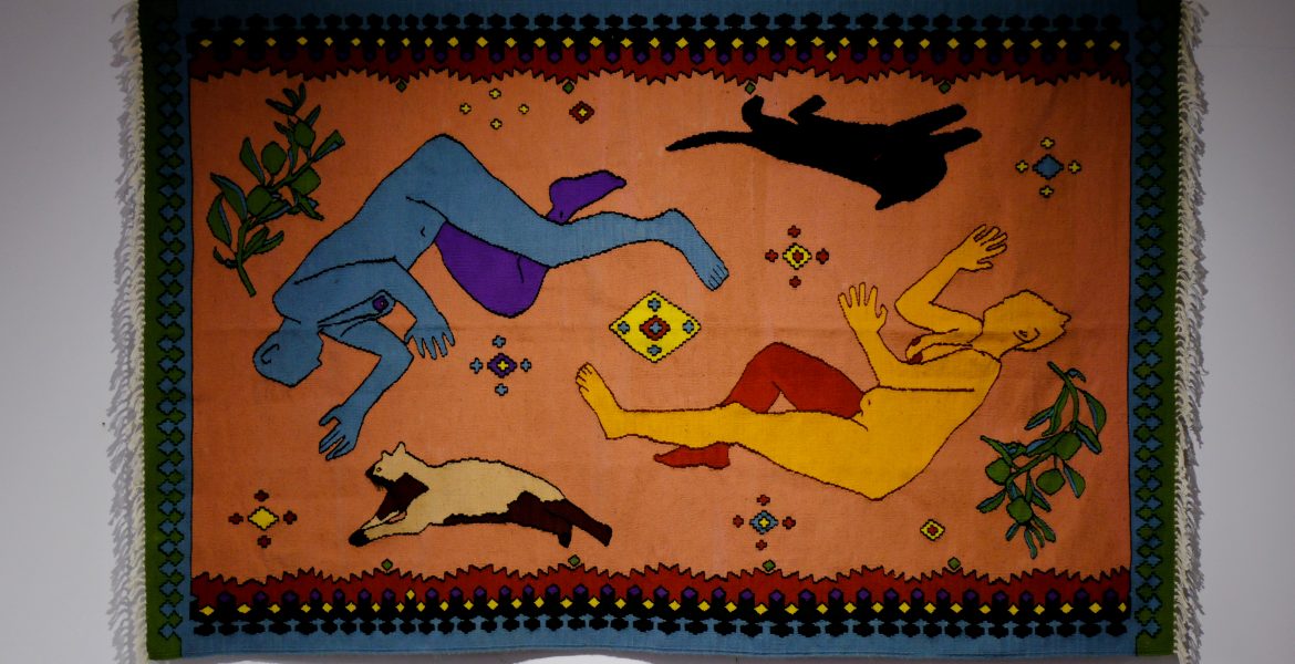 Feature image: Silvi Naçi with Dëshira Maja, Pa Titull (duke nxjerrë në hartë lirinë, me ullinj) / Untitled (mapping freedom, with olives), textile (wool, natural dyes), hand‑crafted in Krujë, Albania, 2024. Displayed at Wrapped in the Shadow of Freedom, Prishtina, 2024. Photo: Zana Begolli. Courtesy of Sekhmet Institute.