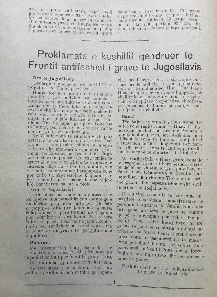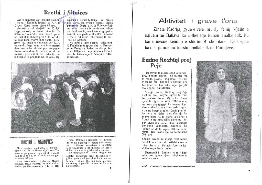 Në nji tjetër artikull të Buletinit më 1947, “Te ja dorzojme tepricat t’ona te drithit shtet t’one”, jepet shembulli i grave të fshatit Ponoshec, në rajonin e Dukagjinit, ku tregohet për vendimin që 100% e tepricave t’i dërgohen shtetit dhe u bahet thirrje grave tjera: “Te bajme çmos qe burrat t’one t’ia shesin drithin shtetit dhe ne kete menyre do ta ndihmojmë kryemjen e planit tone ekonomik. Nga kjo na kemi dobi. Per drithin e shitun do te marrin pare dhe bona per me ble ma shume pelhura, veshmathje, ene dhe vegla bujqesore e tjera”.