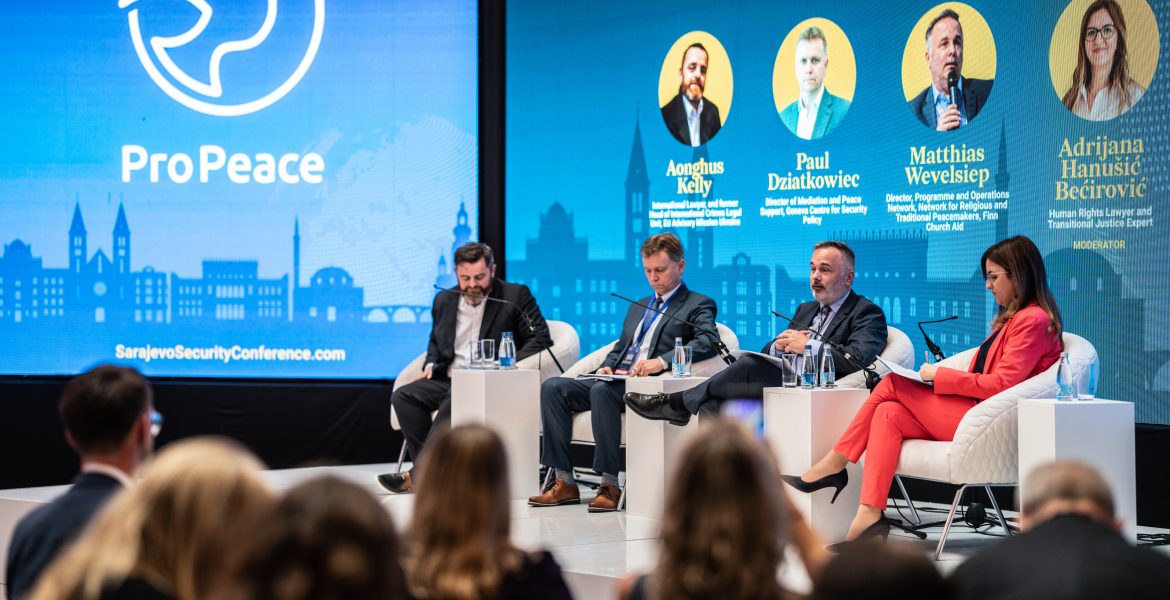 The panel featured Alexander Mauz, Chairman of the Executive Board of Pro Peace, as a featured speaker, alongside Aonghus Kelly, an international lawyer and former Head of the International Crimes Department of EUAM Ukraine; Paul Dziatkowiec, Director for Mediation and Peace Support at the Geneva Centre for Security Policy (GCSP); and Matthias Wevelsiep, Director of Programmes and the Operational Network at the Network for Religious and Traditional Peacemakers within Finn Church Aid. In my dual role as moderator and panellist, I contributed to the discussion from both a facilitative and analytical perspective, shaped by fifteen years of work alongside victims of war crimes in Bosnia and Herzegovina in their quest for justice and access to reparations.